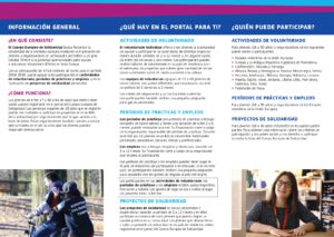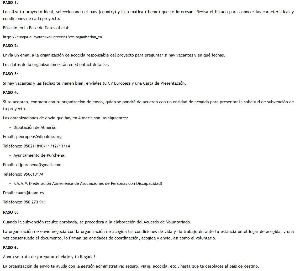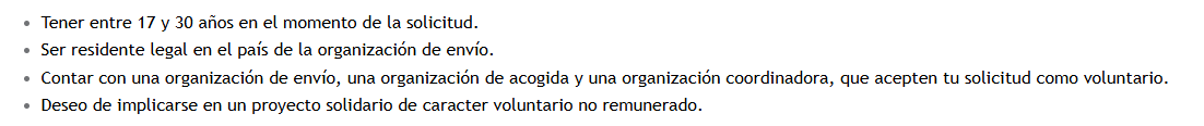¿QUÉ ES? El Cuerpo Europeo de Solidaridad antiguo Servicio de Voluntariado Europeo es un programa de voluntariado internacional. Permite realizar estancias en el extranjero integrado en una comunidad local colaborando en uno de los miles de proyectos disponibles sobre temáticas de las más diversas. A través de esta experiencia de aprendizaje no formal, se mejoran y/o adquieren competencias para el desarrollo personal, educativo y profesional. Para más información: El SVE (Servicio de Voluntariado Europeo) ha modificado su nombre y pasa a denominarse CUERPO EUROPEO DE SOLIDARIDAD. El Cuerpo Europeo de Solidaridad son una experiencia de aprendizaje donde personas jóvenes mejoran y/o adquieren competencias para su desarrollo personal, educativo y profesional, así como para su integración social, desarrollando una actividad de voluntariado en otro país de la Unión Europea. ¿Qué requisitos debo cumplir? El único requisito de este servicio es tener una edad comprendida entre los 17 y los 30 años. No se exige formación de ningún tipo ni tampoco conocimientos de idiomas para participar en el programa. Más información: ¿Cómo puedo ser voluntario?